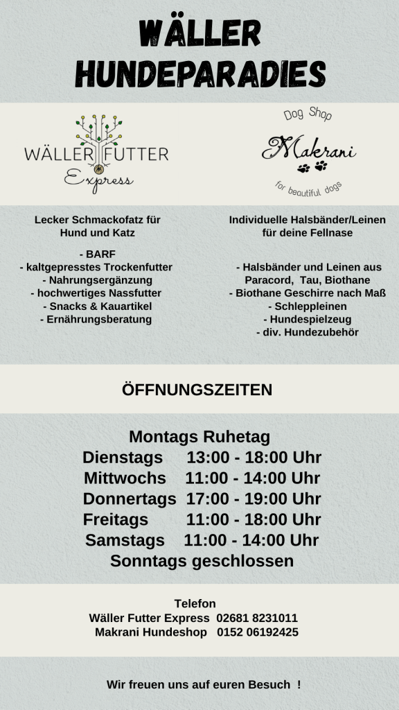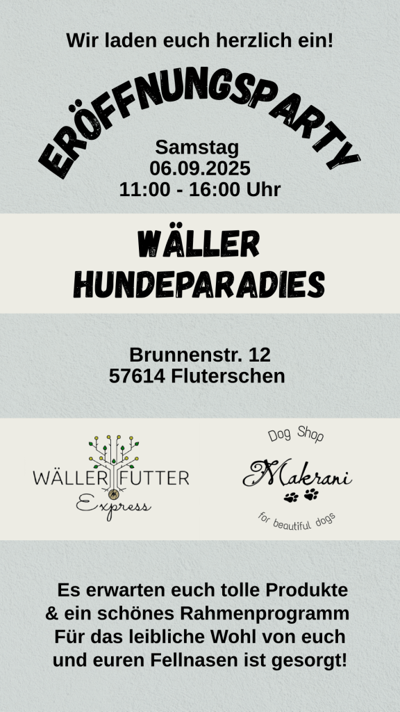 Liebe Kunden, am 06.09. von 11:00 bis 16:00 Uhr findet die Eröffnungsparty von „Wäller Hundeparadies“ statt! Das Hundeparadies besteht aus mir – Makrani und dem lieben Mirco vom Wäller Futter Express 🙂